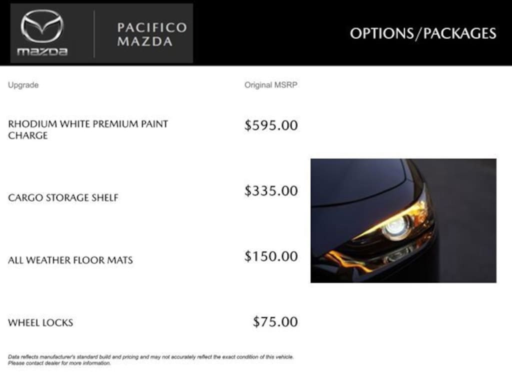 * To qualify for discount, customer must pay cash, arrange own finance or have Pacifico financing through one of these preferred lenders: HMFC, FMCC, Mazda Financial Services, Wells Fargo, TD Bank, 5th 3rd bank, SunTrust Bank, M&T Bank, Huntington National Bank, or a local Credit Union. Not all customers will qualify.