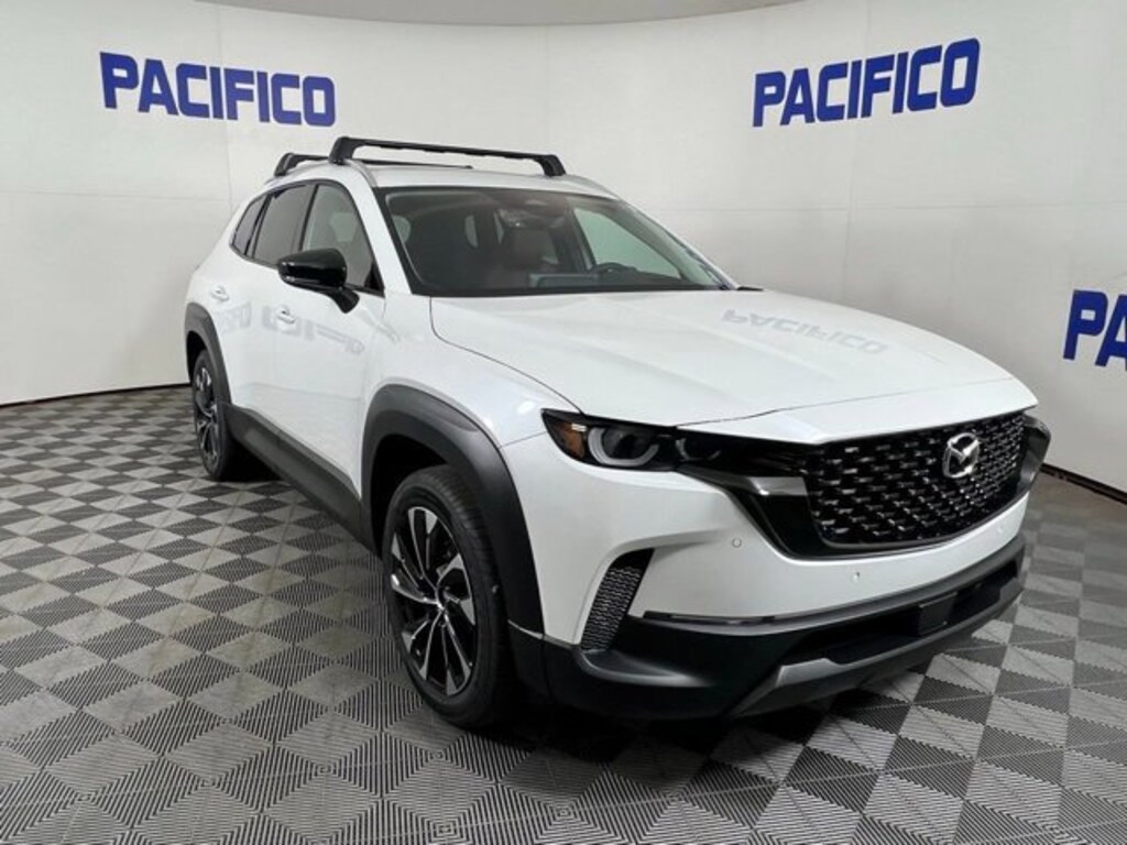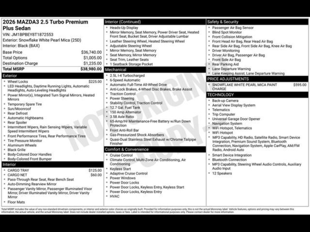 Pacifico Mazda is proud to present you with another great new Mazda. This 2026 Mazda Mazda3 2.5 Turbo Premium Plus is loaded with the following Factory Options:12 Speakers, 4-Wheel Disc Brakes, ABS brakes, Air Conditioning, Alloy wheels, AM/FM radio: SiriusXM, Auto High-beam Headlights, Auto-dimming door mirrors, Auto-dimming Rear-View mirror, Automatic temperature control, Black Lug Nuts and Black Wheel Locks, Brake assist, Bumpers: body-color, Cargo Net, Cargo Tray, Compass, Delay-off headlights, Driver door bin, Driver vanity mirror, Dual front impact airbags, Dual front side impact airbags, Electronic Stability Control, Emergency communication system, Front anti-roll bar, Front Bucket Seats, Front Center Armrest, Front dual zone A/C, Front reading lights, Front wheel independent suspension, Fully automatic headlights, Garage door transmitter: HomeLink, Heads-Up Display, Heated door mirrors, Heated Front Bucket Seats, Heated front seats, Heated steering wheel, Illuminated entry, Knee airbag, Leather Seat Trim, Leather Shift Knob, Leather steering wheel, Low tire pressure warning, MAZDA CONNECT Infotainment System, Memory seat, Navigation system: Mazda Online Navigation, Occupant sensing airbag, Outside temperature display, Overhead airbag, Overhead console, Panic alarm, Passenger door bin, Passenger vanity mirror, Power door mirrors, Power driver seat, Power moonroof, Power steering, Power windows, Radio data system, Radio: AM/FM/HD Audio System, Rain sensing wipers, Rear seat center armrest, Rear side impact airbag, Rear window defroster, Remote keyless entry, Snowflake White Pearl Mica Paint Charge, Speed control, Speed-sensing steering, Split folding rear seat, Spoiler, Steering wheel mounted audio controls, Tachometer, Telescoping steering wheel, Tilt steering wheel, Traction control, Trip computer, Turn signal indicator mirrors, Variably intermittent wipers, and Wheels: 18 x 7J Aluminum Alloy. Recent Arrival!