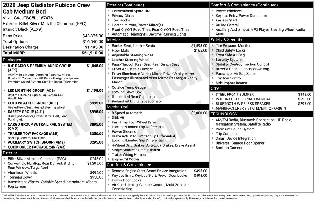 This 2020 Jeep Gladiator Rubicon 4x4 is a highly optioned, low-mileage off-road pickup engineered to handle extreme terrain while still offering everyday comfort and versatility. When new, this Gladiator carried an original MSRP of $60,715, reflecting its Rubicon trim and extensive factory upgrades.