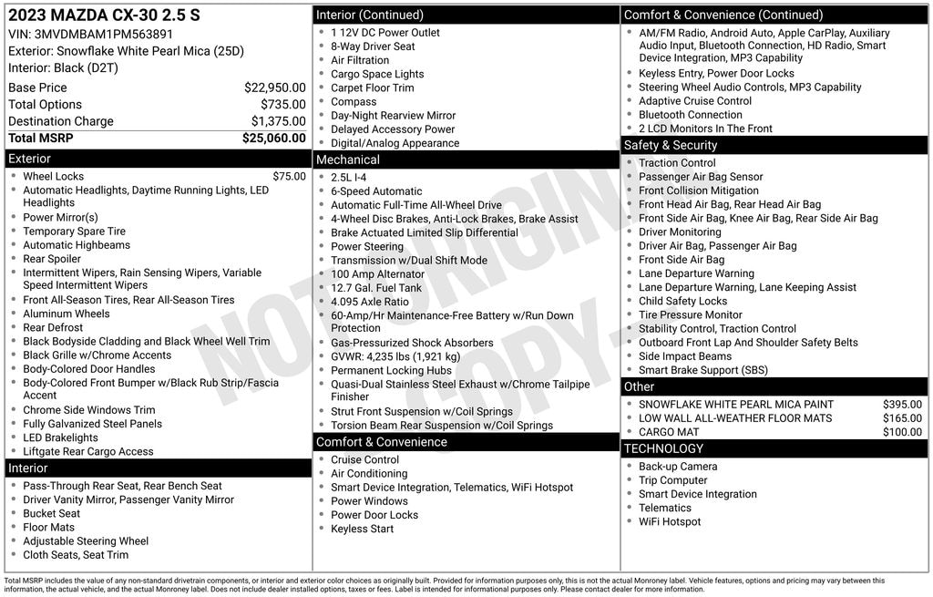 Whether you're commuting to work, running errands, or embarking on a weekend adventure, this 2023 Mazda CX-30 2.5 S is the perfect companion. Experience the exceptional craftsmanship, performance, and features that make this SUV a standout in its class.