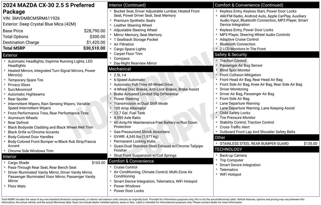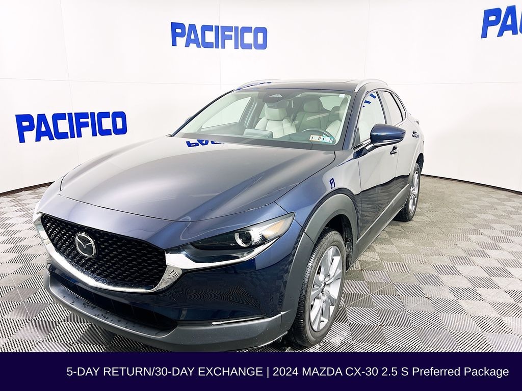 Clean CARFAX. Odometer is 4455 miles below market average! Deep Crystal Blue Mica 2024 Mazda CX-30 2.5 S Preferred Package 4D Sport Utility AWD 6-Speed Automatic SKYACTIV® 2.5L 4-Cylinder DOHC 16V